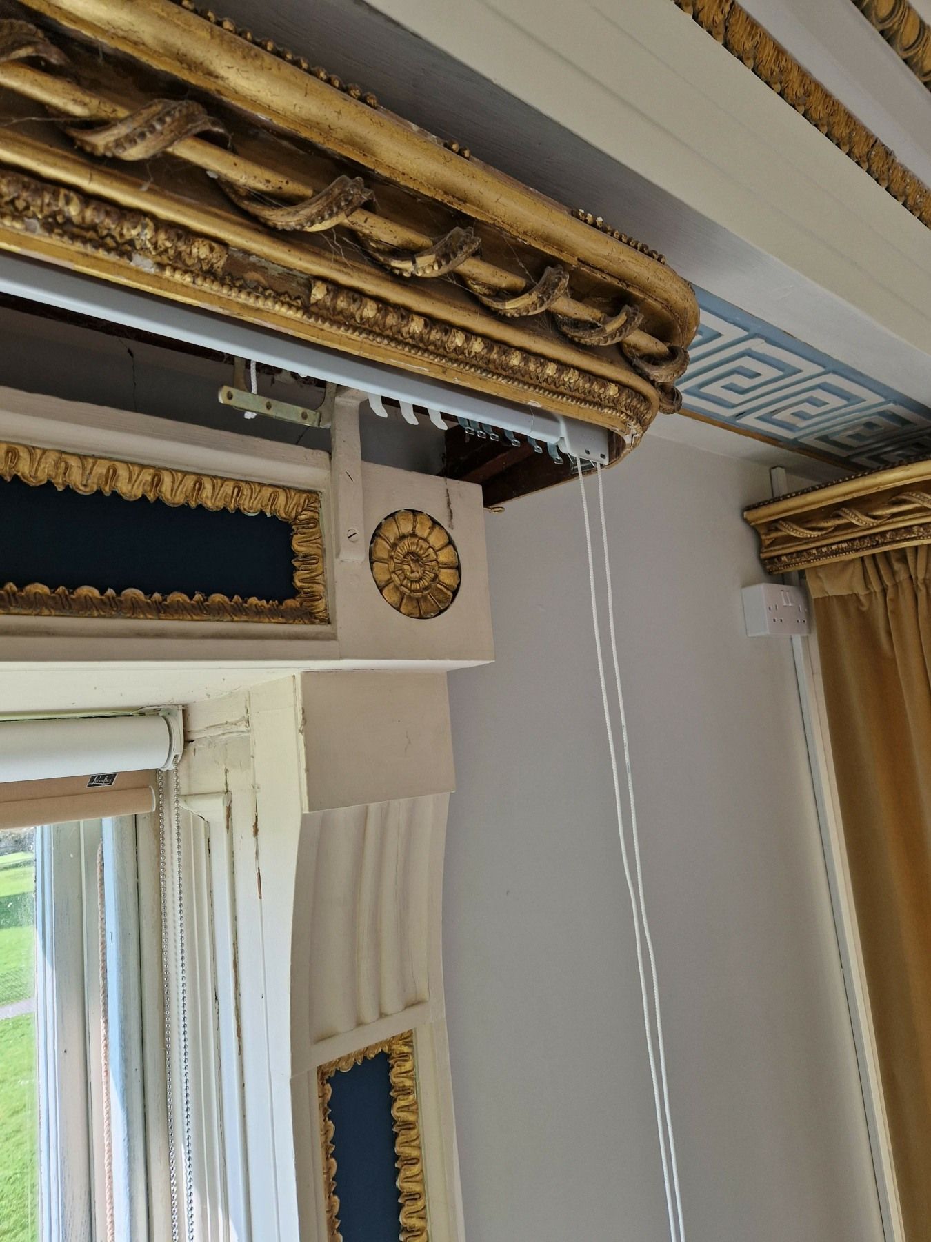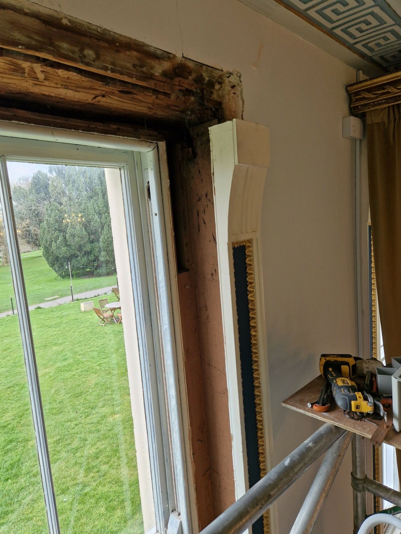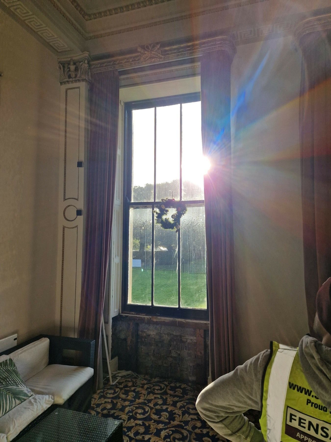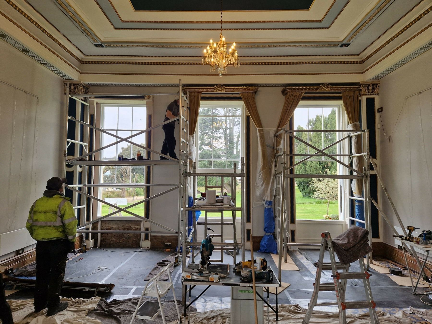 After weeks of meticulous craftsmanship, the new single-glazed Accoya joinery was ready for delivery and installation. The project timeline was tight, with just a one-week window available between scheduled wedding events at Northwood House. Adam and Steve, part of the property maintenance team, played a crucial role in the process, assisting in the removal and cleaning of custom velvet curtains and reinstalling the historic pelmet carvings and trim.